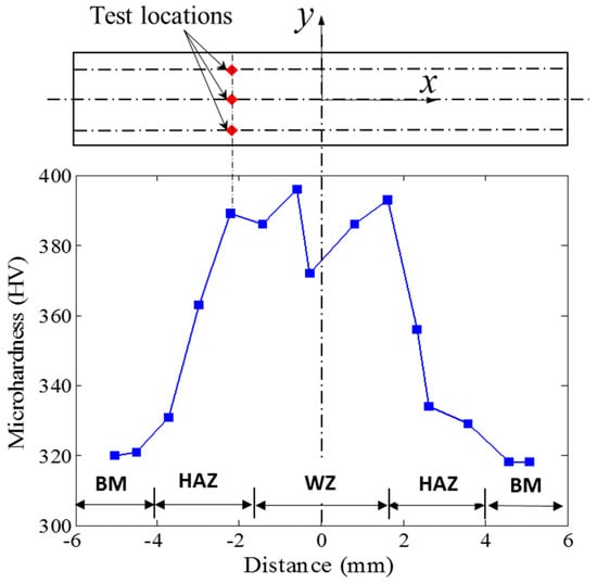 Tensile tests (INSTRON4507, Beijing, China) were performed at room temperature for three specimens of TA15 alloy and its GTAW joint, respectively, according to ASTM E8/E8M at the strain rate of , and the mechanical properties are listed in Table 2. Compared with TA15, the tensile strength of the GTAW joint was essentially unchanged, while its elongation decreased sharply. Moreover, Vickers microhardness tests were executed for three welded specimens, using a computerized Buehler hardness tester with a loading of 500 g and a dwell time of 15 s, and the microhardness values are shown in Figure 3. Note that for each location on the X-axis away from welded center, there are three test points on the Y-axis, and the microhardness of each location is equal to the mean value of them, as shown in Figure 3.