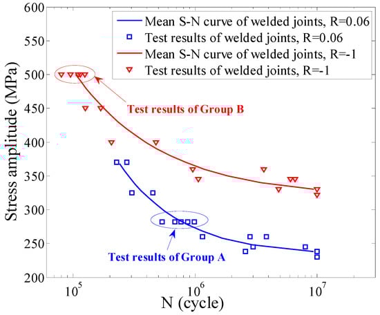 Relationships between the stress amplitude and the fatigue life of all the specimens are shown in Figure 4. Each symbol represents the result of one test sample. The sample was regarded as a runout if it did not fail within cycles. The fatigue life of samples of Groups A and B has been marked in Figure 4. The mean S–N curve was fitted by the experimental data based on the three-parameter S–N model proposed by Weibull: