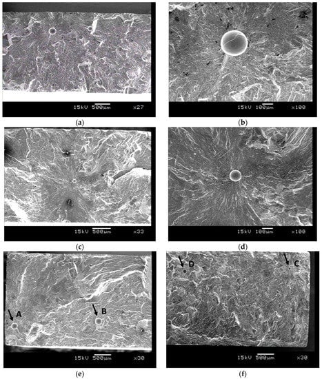 According to the SEM observations of fracture surfaces, all the specimens of Groups A and B had weld pores, which indicates that weld pores are prevalent in TA15-alloy GTAW joints. In addition, it was found that all the fractures originated from weld pores, which suggests that the fatigue crack tends to initiate from weld pores. These results are consistent with those in previous studies [,]. Representative fracture morphologies of the crack initiations are shown in Figure 5. From the fracture morphologies of Group A (Figure 5a,b), it can be seen that the crack initiates from the pore and propagates around it, and a few secondary cracks are found around the edge of the crack-initiation pore. Figure 5c,d shows the fracture morphologies of Group B. Compared with that of Group A, the crack-initiation region is smoother, and friction traces can be easily observed, which are caused by the crack closure behaviors under the negative stress ratio. Besides, there are more secondary cracks around the crack-initiation pore, due to the higher stress amplitude. Figure 5e,f gives two typical fracture morphologies containing pores with different locations. In practice, there are always multiple pores in welded joints, while only one of them would be the primary crack initiation and cause the final fracture; the rest of them would be located in the propagation or final fracture regions. In Figure 5e, the crack initiates from pore A and then propagates through pore B to the right. In Figure 5f, the crack initiates from pore C and there is a pore D located in the final fracture region. In addition, it is worth noting that the crack initiations would also occur from other sites, for example the left surface edge in Figure 5e, which are likely caused by cyclic slip; even so, they contribute little to the propagation of the primary crack and final fracture.