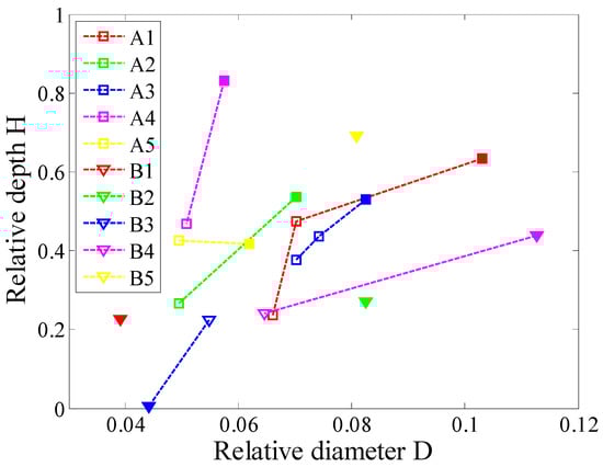 Figure 7 shows the relationship between relative diameter and relative depth of all the observed pores. Each line represents a sample, and each marker on the line represents a pore on the fracture surface of the same sample. The solid marker denotes the critical pore, which is defined as the pore leading to the crack initiation and sample failure. The hollow marker denotes the pore in other regions.
