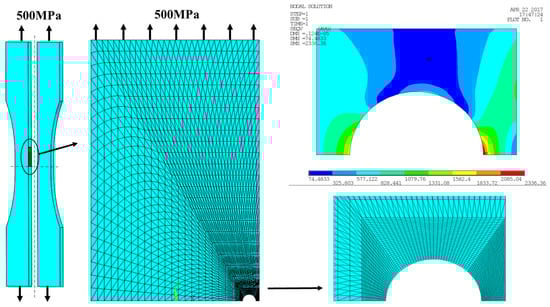 In order to analyze the combined effect of pore diameter and depth on stress concentration in detail, a series of finite element simulations based on ANSYS were employed. 2-D finite element models containing pores with different diameters and depths were established, according to the actual size of specimens. Geometrical features of 2-D finite element models are similar to each other. Hence, only one example is presented here, as shown in Figure 8. The material matrix is modeled to be elastic. The model is meshed by 2335 4-node quadrilateral elements.