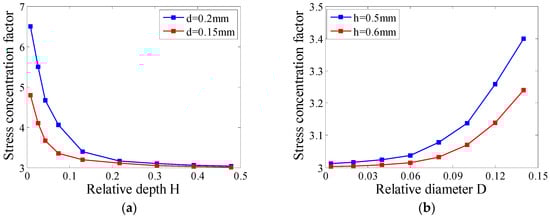 (a) Variation of the stress-concentration factor with the increase of relative depth where the pore diameter is equal to 0.2 mm and 0.15 mm; (b) variation of the stress-concentration factor with the increase of relative depth where the pore depth is equal to 0.5 mm and 0.6 mm.