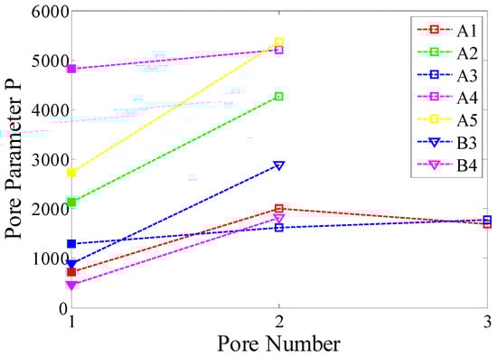 Figure 10 shows the indicator P of pores in samples with multi-pores on the fracture surfaces. Each line represents a sample and each marker on the line represents a pore in the fracture surface of this sample. The solid markers denote the critical pores, and the hollow markers denote the pores in other regions. It can be seen that the crack initiated from the pore with the smallest indicator P for all samples, which shows that P can be regarded as an indicator to judge the crack initiation. That is, in an individual specimen, the pore with the smallest P would be the most likely location of the crack initiation. In this study, we provided an expression (Equation (5)) of P based on the finite element analysis. The expression has been accessed by the pore data in this study, and the results show that it satisfied the data well. Nevertheless, it needs to be noted that pores in this study solely refer to the pores observed on the fracture surface, and an individual specimen generally contains many other pores. Similar work would be encouraged to obtain all pores’ geometrical characteristics by non-destructive techniques in order to find a more suitable expression of P, if the detection threshold and measurement accuracy can reach a high level.