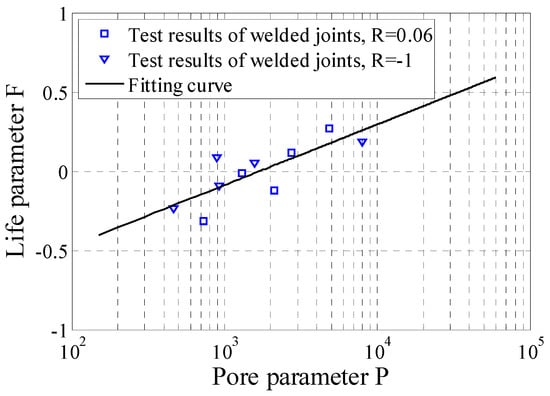 where m = 0.166, and C = −1.234. A common indicator for evaluating the goodness of fitting is the coefficient of determination . This describes how well the regression model represents a set of real observations, which ranges from 0 to 1. Perfect regression occurs when , which means that the dependent variable is entirely determined by the independent variables involved in the regression model. The here is equal to 0.628, which indicates that the lnP can explain 62.8% of the information of indicator F. It means that the scatter of fatigue life of welded joints is mainly caused by the weld pores. The remaining 37.2% of the information of indicator F can be interpreted by other factors, which means that the scatter of fatigue life is also caused by other uncertainties, such as material organization, stress, experimental environment, etc.
