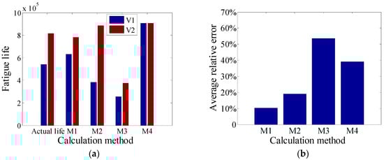 Comparisons of actual results and the calculations by Equation (8) (M1), the model in [] (M2), the model in [] (M3), and Equation (1) (M4), are shown in Figure 12. Figure 12a shows the fatigue life results of the samples V1 and V2, respectively, and Figure 12b shows the average relative errors between actual fatigue life and calculated fatigue life. It can be seen that the fatigue life calculated by M1 is closest to actual fatigue life, and has the smallest average relative error compared with other models. The observations of Figure 12 indicate that the model proposed in this study has a higher estimation accuracy of fatigue life.