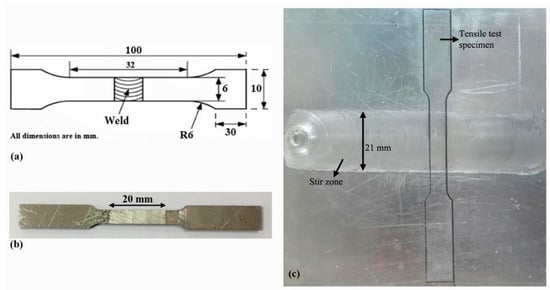 (a) Schematic design of the tensile test specimen, and (b) tensile test specimen for FS- and (c) FSV-welded specimens.