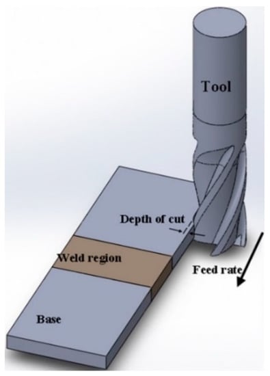 Machining characteristics of three samples, namely base material, zones of FS welded and FSV-welded samples were studied. Longitudinal grooves along the edge of the samples were machined and cutting forces were measured. The rectangular samples with dimensions of 100 mm × 50 mm and thickness of 3 mm were clamped on the fixture to perform stable cutting along the longitudinal edge and avoid machining vibration that may affect the cutting force and machining process. For welded specimens, the longitudinal edge was normal to the weld line. A schematic design for the cutting process is presented in Figure 4. Cutting forces were measured during milling at a sampling rate of 5 µs by using a Kistler 5070 dynamometer (Kistler, Winterthur, Switzerland) mounted on the machine table. A helical end-mill made from high speed machining (HSM) steel was used as a cutting tool. The specifications of the mill tool are provided in Table 2 and the milling conditions are presented in Table 3.