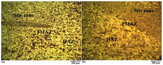Microstructures of welded regions consisting of FSW zone, TMAZ, and HAZ for FS- and FSV-welded specimens are presented in Figure 5. Microstructures of zones for both welded specimens, as well as base material, are represented in Figure 6 with more magnification.