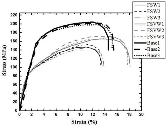 Stress-strain curves of FS- and FSV-welded specimens, as well as the base material.