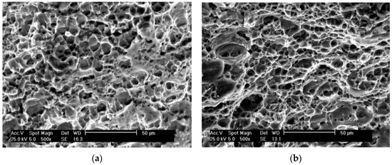 The higher ductility of FSV-welded specimens may also be related to grain size effect in the FSW zone. Various studies have been carried out to determine the effect of grain size on ductility. Some findings have shown that ductility increases as grain size decreases [34,35]. It is believed that a high dislocation density allows a higher degree of plastic deformation and, thus, it provides a high ductility. Transmission electron microscopy images showed that the grain boundaries increase the dislocations density through the generation of new dislocations called geometrically necessary dislocations (GNDs) [36,37] and ductility increased as the grain size decreased. Spittle [38] noted that small grains have a higher resistance to crack propagation due to strain distribution between a greater number of grain boundaries. Ductility enhances in AZ31 magnesium alloy due to the transition in the fracture mechanism from intergranular fracture to transgranular fracture as grain size decreases [39]. SEM pictures of fracture surfaces for FS- and FSV-welded specimens are presented in Figure 9. Both samples show fracture surfaces consisted of voids which is a characteristic of a ductile fracture. Void formation, void coalescence, and crack propagation are three steps which result in fracture in ductile materials and more voids in fracture surface of a ductile material indicate in more ductility [40,41]. Based on Figure 9, the voids for the FSV-welded specimen are more than the other specimen. This indicates that the former specimen has strained more than the latter one before fracture. This agrees well with tensile test results presented in Figure 8.
