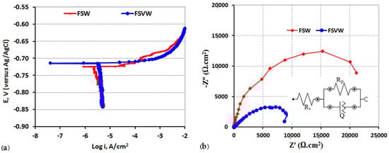 The polarization and Nyquist diagrams of two FSW and FSVW samples are illustrated in Figure 10. Considering the polarization curves in Figure 10a and using the Tafel extrapolation method, corrosion rates of about 2.7 µA/cm2 and 5.3 µA/cm2 were obtained for FSW and FSVW samples, respectively. This indicated the better corrosion resistance of FSW samples as compared with FSVW. The larger Nyquist semicircle for the FSW sample in Figure 10b confirms the lower corrosion rate of this sample. According to the Stern-Geary equation (Equation (2)), the corrosion current density and, therefore, the corrosion rate is inversely related to the polarization resistance:
