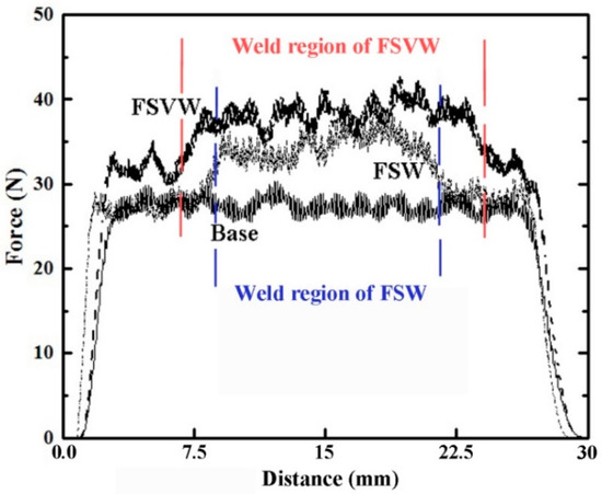 Cutting force measurements along the cutting path for base material, and FS- and FSV-welded specimens are shown in Figure 11. It is observed that the cutting force for base zones of three samples are about the same, but the force increases in the welded region. It is also observed that the cutting force for welded region of FSV-welded samples is higher than the FS welded samples. These observations can be related to grain size changes during the welding process [45,46].