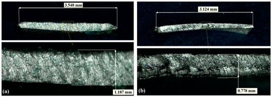 Presentation of chip cross section for different samples, (a) FSW zone of FS welded sample, and (b) FSW zone of FSV-welded sample.