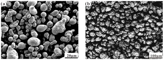 SEM (scanning electron microscope) images: (a) Gas atomized Al7075 powders; (b) as-synthesized Ti52Cu20Ni17Al11 metallic glass powders.