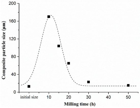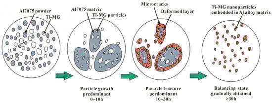 As is shown in Figure 6, the composite powders were broken into many smaller powders when the milling time was increased to more than 30 h. The main reason for this is that cold working enhanced with milling, which would result in work hardening [34]. Therefore, the composite powders became more and more brittle with increasing milling time, and gradually fractured into many smaller powders, which can be clearly seen in Figure 6d. A phenomenon was also observed, in the mechanical milling of Al-B4C nanocomposite powders, whereby large particles became brittle in the late milling stage, and then gradually fractured [37]. Fractured small powders further facilitate plastic deformation, and therefore a dense and uniform dispersion of MG nanoparticles in the matrix ultimately formed. The morphological and microstructure changes in composite powders with milling are further schematically illustrated in Figure 8.