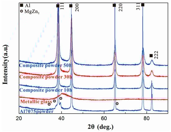 Figure 4 shows the XRD patterns of the initial and composite powders milled for different times. The as-synthesized Ti52Cu20Ni17Al11 metallic glass powders are proved to be amorphous by the typical broad diffraction maxima at 2θ = 40.8°, without any detectable crystalline Bragg peak. The XRD patterns of the composite powders show sharp Bragg peaks, which corresponds to the Al matrix. No peaks belonging to additional phases can be observed, indicating that the amorphous state of the glassy particles in the composite powders is maintained. Moreover, the Al peaks were broadened, and their intensities gradually decreased with the increased milling time, indicating a gradual reduction in the crystallite size, as well as an increase in the lattice strain, which is in accordance with the typical results of milling aluminum and aluminum alloys [34]. The precipitates (MgZn2) in the Al7075 alloy matrix were dissolved with milling, which can also be found in our previous work on Zr-based metallic glass fiber-reinforced AMMCs [1].