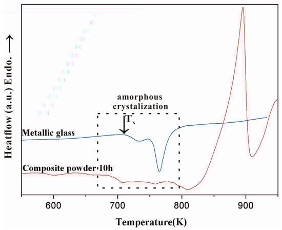 The amorphous nature of the glassy phase in composite powders can also be verified by the DSC results (shown in Figure 5). The Ti52Cu20Ni17Al11 MG powders display two partial overlap exothermic events with the onset (Tx) at 716 K, which corresponds to the crystallization of the amorphous phase; it is also close to 718 K, which is the crystallization temperature of Ti60Cu15Ni15Al10 metallic glass [35]. At a similar position, weak exothermic peaks exist on the DSC curve of the composite powders, indicating that the Ti-based reinforcing phase remained in an amorphous state during ball milling.