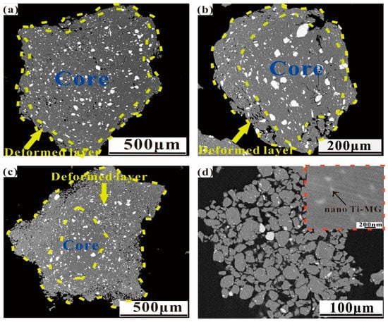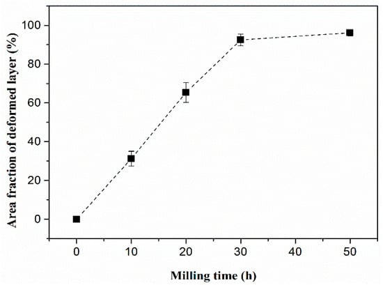 The MG microparticles in the composite powders gradually changed into MG nanoparticles, with milling. The cross-section SEM micrographs of the composite powders are shown in Figure 6. The bright phase corresponds to the MG particles, while the dark phase corresponds to the Al7075 matrix alloy. At the initial milling stage (<10 h), the Al7075 matrix alloy powders (~10 μm) were cold-welded, and grew; meanwhile, the MG microparticles were captured by the coarser Al7075 matrix alloy powders (Figure 6a). During milling, severe plastic deformation occurred at the surface of the composite powders, which suffered high-energy impacts [34]. Severe plastic deformation also can occur, firstly at the surface of pure amorphous powder, and form a deformed surface layer [36]. Therefore, a deformed layer formed, and its thickness increased with increasing milling time. The deformed layer is shown in Figure 6. The area fraction of the deformed layer with milling time is shown in Figure 7. The MG microparticles were fractured into submicro- and/or nano- particles, owing to the large shear deformation in the deformed layer, whereas the center part of the composite powders remained undeformed or less deformed where the MG microparticles remained micro size.