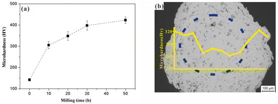 (a) Microhardness of the composite powders as a function of milling time; (b) microhardness distribution within a single composite powder.