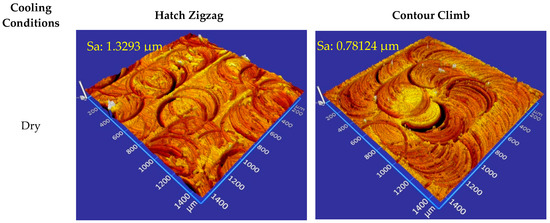 The surface area roughness (Sa) and root mean square roughness (Sq) values of the surfaces obtained from the 3D surface topographies are presented in Figure 6 and quantified in Figure 7. Both the surface area roughness and root mean square roughness values are lower in the contour tool path strategy than the hatch tool path strategy—except under flood coolant conditions. The results are consistent with the research that has been carried out in previous studies [22]. The best surface quality was obtained under flood cooling conditions in both tool path strategies, while the worst surface quality was obtained by the hatch tool path strategy under dry cutting conditions. Aramcharoen and Mativenga [32] modeled the energy demands of the machine in order to evaluate different tool paths—zigzag x- and y-axis, zigzag x-axis, contour, and spiral—and as a conclusion of the comparison, emphasized that the contour tool path strategy was the most efficient and resulted in the best surface quality.