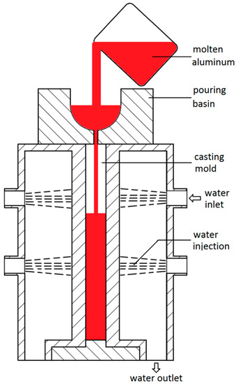Four Al-5Mg-0.8Mn alloys with different Fe and Si levels were cast. The contents of Fe and Si in the alloys varied from less than 0.1 to 0.5 wt %. Pure Al ingots (Fe < 0.10 wt % and Si < 0.04 wt %), Mg ingots (99.9 wt %), Al-30Si and Al-10Fe mater alloys were employed to create the experimental alloy samples. For each alloy sample, two kilograms of raw materials were melted in an electric resistance furnace (General Furnace, Shenyang, China). The crucibles used were made of graphite-clay. The molten Al alloy was refined by adding 0.1% grain refiner (Al-5Ti-B), degassed by injecting Ar into the pool, then cast at around 725 °C by using the apparatus shown in Figure 1. The chemical compositions of the cast alloys were analyzed by emission spectroscopy and listed in Table 1.