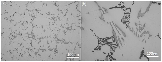 The as-cast microstructures of Alloy 4 cast under (a) near-rapid cooling and (b) slow cooling.
