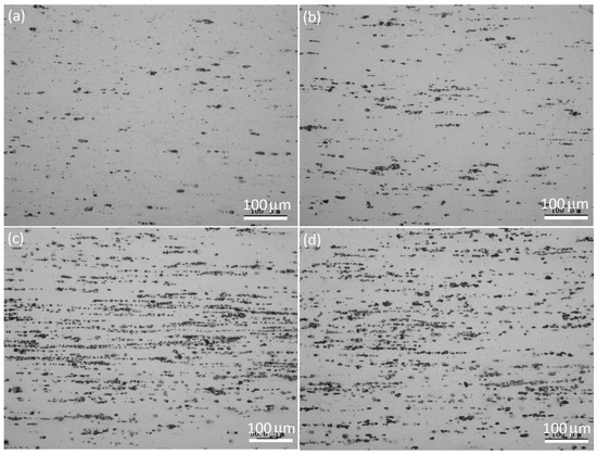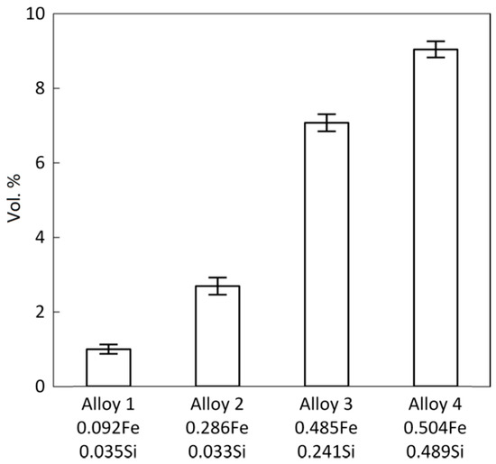 Figure 3 shows the particle structures of the hot bands. The size and density of the particles in the hot bands were a function of the contents of Fe and Si in the alloys. In Alloy 1 with 0.09 wt % Fe and 0.035 wt % Si, the particles were rare and small. It could be seen from Figure 3a that only a few particles were scattered on the matrix. With the increase of Fe and Si contents in the alloys, the density of the particles increased correspondingly. In Alloy 2 with 0.25 wt % Fe, the particle volume increased remarkably. Further increasing the contents of Fe and Si gave rise to a significant increase in the amount of particles. In Alloy 3 with 0.5 wt % Fe and 0.25 wt % Si, the dense particles formed a linear structure along the rolling direction (Figure 3c). In Alloy 4 with both high Fe and Si contents, the particles were quite uniform in size and distribution. The volume fraction of the particles was larger than that in Alloy 3. The volume fractions of the particles in the alloys were measured by an image analysis system and shown in Figure 4.