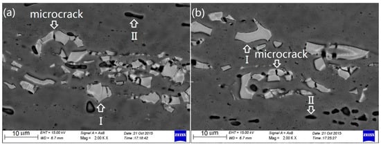 The particles were analyzed by SEM. Figure 5 shows their backscattered electronic images. It could be seen that there were two types of particles distinguished by color. They were marked as I and II, respectively, on the figure. The particles were the broken intermetallics. During hot rolling, the intermetallics that precipitated during casting broke into fragments. In Alloys 1 and 2, the particle structures mainly consisted of type I particles. The type II particles were minor phases and could only be found occasionally. However, in Alloys 3 and 4, both the type I and type II particles were major phases. They bestrewed on the metallographic surfaces. Under high magnification, it could be seen that there were many microcracks or cavities between the fragments of the type I intermetallics, especially in Alloy 3.