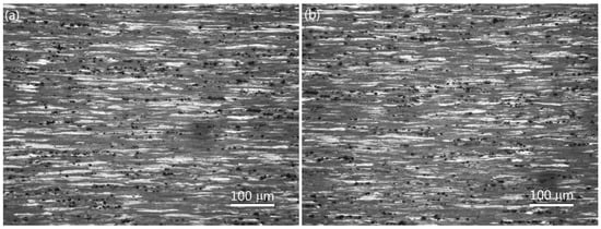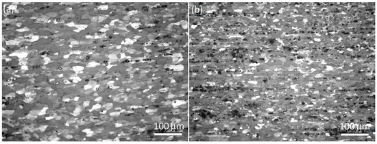 The deformed grain structures of the cold rolled sheets of (a) Alloy 3 and (b) Alloy 4.