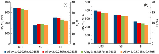 Figure 9a shows the tensile properties of the fully recrystallized hot bands with different Fe and Si contents. It could be seen from the figure that Alloy 1 with low Fe and Si contents demonstrated a best combination of high tensile strength and elongation. Increasing the contents of Fe and Si caused a decrease in the tensile properties. However, the deteriorating extent of the mechanical properties caused by Fe and Si was quite small. Comparing Alloy 1 (with low Fe and Si) to Alloy 4 (with high Fe and Si), ultimate tensile strength (UTS) reduced by 5.2% and elongation (El) reduced by 11.5%. However, on the other hand, the high Fe and Si containing alloy still showed a relatively high tensile strength and elongation: it met the typical mechanical properties of AA5083 alloy at O temper [30]. Figure 9b shows the tensile properties of the cold rolled sheets which were stabilization treated at 150 °C for 2 h. The sheets were subject to heavy deformation and no recrystallization took place during stabilization treatment. Similar to the hot bands, the mechanical properties deteriorated with the increase of Fe and Si. The decrements of the tensile strengths (both ultimate tensile strength and yield strength) were also small, but elongation decreased quite remarkably. The cold rolled sheets were subjected to treatment equivalent to H34. Compared to the typical mechanical properties of AA5083 alloy at H34 temper, Alloy 4 had higher tensile strength and equivalent elongation. This meant that under the condition of casting under near-rapid cooling, the alloy with high Fe and Si contents could still match the typical mechanical properties of AA5083 alloy.