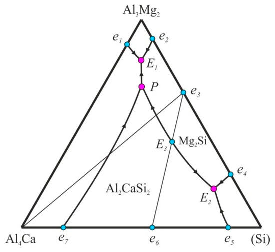 In terms of temperature and phase composition, these five-phase reactions are close to the corresponding four-phase reactions in the Al-Mg-Si system (points e2 and e4 in Figure 1). The point P corresponds to the peritectic reaction L + Al2CaSi2 → (Al) + Al4Ca + Mg2Si. If we assume the existence of the quasi-ternary cross-section Al-Al2CaSi2-Mg2Si, then one more invariant reaction L → (Al) + Al4Ca + Mg2Si is possible in the quaternary system (point E3). Such situations are typical of some other quaternary systems, such as Al-Cu-Mg-Si and Al-Fe-Mg-Si [4,34].