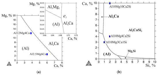 Since the primary crystals of the second phases are certainly undesirable, we calculated the liquidus surfaces. In the ternary Al-Ca-Mg system, with an increase in the magnesium content, the eutectic polytherm (corresponding to the reaction L → (Al) + Al4Ca) shifts toward the lower calcium concentrations (Figure 2a). On the basis of this polytherm, two ternary alloys—Al-4% Ca-12% Mg and Al-6% Ca-2.5% Mg, hereinafter Al12Mg4Ca and Al2.5Mg6Ca—were chosen for further consideration. According to their positions in the diagram (marked in Figure 2a), these alloys should have near-eutectic microstructures.