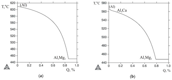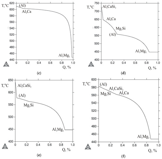 Since the actual solidification of most alloys is generally different from equilibrium, the evaluation of the phase composition of the casting or ingot in the as-cast state requires special techniques. One of the most commonly used techniques is the Scheil-Gulliver model, which is implemented in the Thermo-Calc program [33]. Figure 4 shows the nonequilibrium solidification curves (T-Q) calculated for the selected alloys using the given model. The Al-10% Mg alloy was considered as the reference one, and its T-Q curve is shown in Figure 4a. In the Al12Mg4Ca and Al2.5Mg6Ca ternary alloys, the eutectic reaction L → (Al) + Al4Ca starts almost immediately after the formation of the primary (Al) crystals (Figure 4b,c). The solidification of these alloys ends with the invariant reaction L → (Al) + Al4Ca + Al3Mg2. The difference between these alloys is that in the former alloy, more than 20% of the liquid phase solidifies by this reaction, and in the latter one, about 2%.
