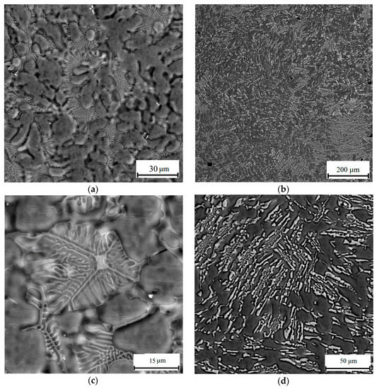 Microstructure of near-eutectic ternary alloys Al4Ca12Mg (a,c); and Al6Ca2.5Mg (b,d), scanning electron microscope (SEM) (Backscattered electrons (BSE)).