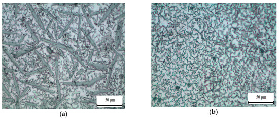 It is advisable to alloy aluminum–magnesium alloys with silicon, which is included in a number of branded alloys (for example, 512) with a content of 1.5–2% [1,5,6,7]. Silicon (Si) maintains a low density (it forms, with magnesium (Mg), the Mg2Si phase, the density of which is only 1.88 g/cm3 [2]) and high corrosion resistance, while also increasing the hardness and casting properties of the alloy. A large number of works reported alloys based on the Al + Mg2Si eutectic, which have a structure typical of composites [8,9,10,11,12,13].