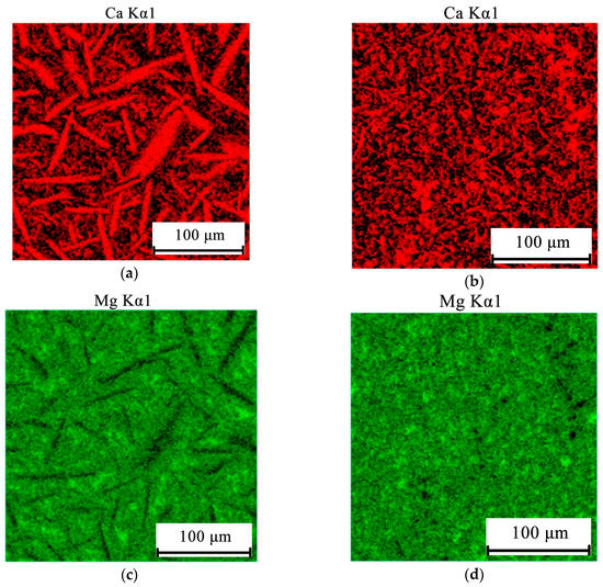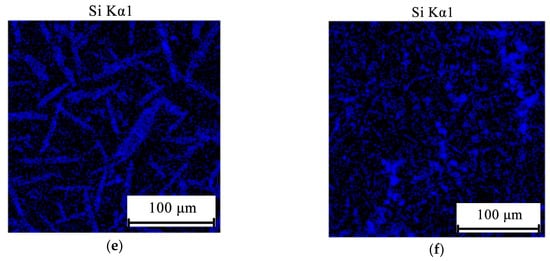 As we expected (see Figure 2b), the structure of the Al10Mg10Ca2Si and Al10Mg4Ca2Si hypereutectic alloys is characterized by the presence of primary crystals of Ca-containing compounds, which are clearly revealed in the optical microscope (Figure 6). These crystals are enriched with calcium and silicon (Figure 7). The results of a quantitative analysis of the composition of these crystals, which was carried for the largest particles, show that in the Al10Mg4Ca2Si alloy, they correspond sufficiently well to the compound Al2CaSi2 (Table 1). This experimental result agrees with the calculation according to which this particular ternary compound crystallizes first (Figure 4e). Some detectable amount of magnesium is probably associated with a high content of this element in the alloy and, as a consequence, with “backlighting”.