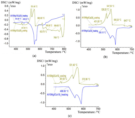 DSC heating and cooling curves for the quaternary alloys: (a) Al10Mg10Ca2Si (b) Al10Mg4Ca2Si (c) Al10Mg3Ca1Si.