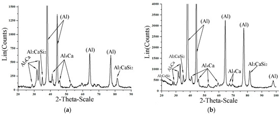 XRD patterns for the alloys Al10Mg10Ca2Si (a) and Al10Mg4Ca2Si (b).