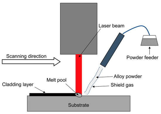 Prior to the laser cladding experiment, the surface of the substrate was mechanically ground with sandpaper, and then cleaned with acetone to remove any pollution. The roughness (Ra) of the substrate after the grinding process was about 1.6–3.2 μm. The alloy powder was dried to ensure its good fluidity.