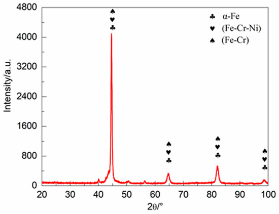 The X-ray diffraction pattern of the Fe-based coating is presented in Figure 2. According to the X-ray diffraction peaks, it could be found that the cladding coating might consist of α-Fe, (Fe-Cr) and (Fe-Cr-Ni). The solubility of Cr in Fe is 100%, and the solubility of Ni in Fe is 10% at room temperature. Cr and Ni will replace Fe atoms in α-Fe to form substitutional solid solutions. Because Cr and Fe could form infinite solid solution, as well as the fact that the content of Ni is small, it could be concluded that the coating mainly consists of α-Fe phases, including Fe and the solid solution of Fe with Cr and Ni.
