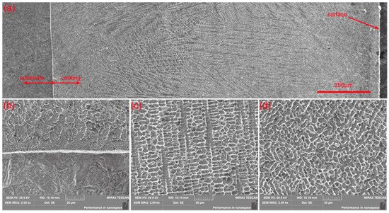 The cross-section microstructures of the laser cladding specimen under OM and SEM are presented in Figure 3 and Figure 4, respectively. Figure 4a shows the cross-sectional view of the laser cladding specimen. It can be found that there were no pores, cracks or other defects in the cladding coating. Figure 3a–c and Figure 4b–d display the microstructure of the bottom, middle, and upper regions of the cladding coating, respectively. The SEM micrographs show a similar dendritic structure to that of OM. Obviously, the cladding coating exhibits a gradient distribution in depth. The bright bounding interface region in Figure 4b is an indication of metallurgical bonding, suggesting excellent bonding strength between coating and substrate.
