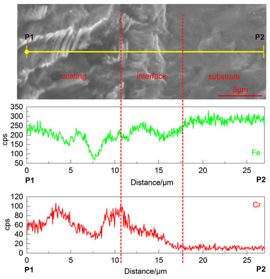 The results of elemental analysis of EDS line scanning at the bounding interface region between the laser cladding coating and the 35CrMo substrate are presented in Figure 5. For the accuracy of results, Fe and Cr—elements with higher content—were selected as the object of analysis. According to the results of line element analysis from P1 to P2, the compositional changes of the elements Fe and Cr are very obvious. The element Cr increased from the substrate to the coating, while the element Fe was the opposite. The diffusion of the various elements in the interface region can be attributed to the dilution of the 35CrMo substrate and Fe-based alloy powder in the melt pool, which contributes to the metallurgical bonding between the coating and the substrate [15].