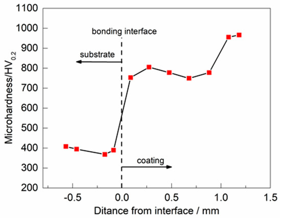 The microhardness at the cross-section of the coated specimens was tested from surface to substrate by a micro-hardness tester (HVS-1000, Huayin, Laizhou, China). The load was 200 g and the duration was 15 s. The minimum distance between adjacent points is about 0.2 mm for accurately measuring the change of microhardness.