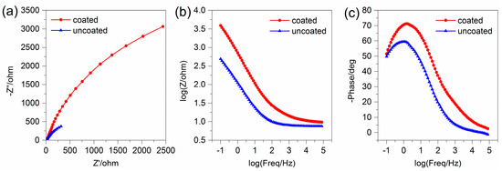Impedance spectra of coated and uncoated specimens in 3.5% NaCl solution: (a) Nyquist curves; (b) Bode-impedance; (c) Bode-phase.