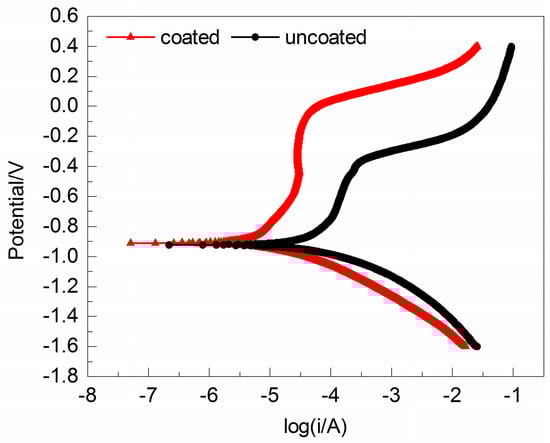 Polarization curves of coated and uncoated specimens in the 3.5% NaCl solution.