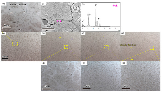 Figure 1a,e,f shows the metallographic and SEM micrographs of the as-cast microstructure of unmodified test steel (0RE). The results show that most of the eutectic carbides distribute in net shape and are generally coarse, Energy dispersive spectrometer (EDS) analysis shows these are (V, Mo)xCy (Figure 1g). In addition, the as-cast microstructures of modified test steels are shown in Figure 1b–d,h–j. The structural difference between unmodified and modified test steels are that the dendritic spacings turn into fine structures and eutectic carbides are refining or even disappearing. The secondary dendrite arm spacing of the as-casted specimens are quantitatively analyzed, as shown in Figure 2. The results show that the spacing of secondary dendrite arm was decreased from 72 μm to 25 μm with different additions of RE. It indicates that RE has a role in refining the secondary dendrite arm and the precipitation of eutectic carbides. A similar refining of the precipitation of eutectic carbides with a certain amount of RE addition was also described by J. Hufenbach [15] and Fu [18].