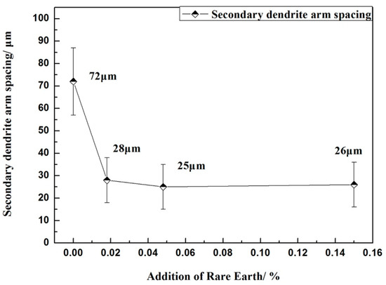 The secondary dendrite arm spacing of the specimens as-casted with different additions of RE.