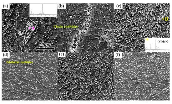 The morphology of the annealed carbides in test steels was systematically investigated by metallographic and SEM micrographs, as shown in Figure 3 and Figure 4. The results show that the morphology of the annealed carbides gradually becomes ellipsoid and the chain carbides become less when adding the RE. Most notably, some large clusters of the annealed carbides are observed, as shown in Figure 4a,b in the unmodified test steel (0RE). However, dispersion distributions of ellipsoid annealed carbides were observed in the observation field when adding RE (Figure 4d–f). In addition, coarse eutectic carbides are commonly found in the unmodified test steel (Figure 4b,c), EDS analysis shows that these are (V, Mo)xCy. However, less coarse eutectic carbides are found in steel with RE addition (Figure 4d–f).