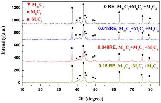 The quantitative analysis and crystal structure types of the tempered carbides of the test steels are examined by XRD. The corresponding patterns are shown in Figure 6 and the results are summarized in Table 2. The results show that the carbides of M7C3, M8C7 and M23C6 are detected in all test steels. In addition, the amount of the tempered M8C7 carbides slightly increases initially and then decreases with the alteration of RE addition from 0.018 to 0.15 wt %. The effect of RE on the amount of the M8C7 carbides was also described by J. Hufenbach for high-strength Fe85Cr4Mo8V2C1 cast steel [15].