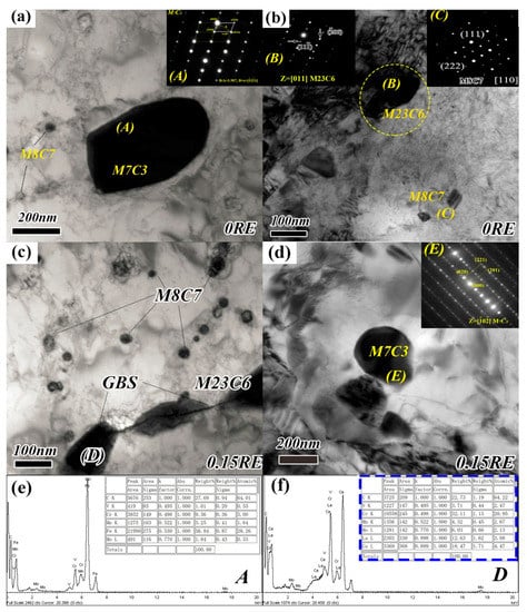 Meanwhile, the tempered carbides in unmodified (0RE) and modified test steels (0.15RE) are observed using both TEM bright-field (BF) observation and selected area electron diffraction (SAED) pattern in order to investigate the crystal structure and chemical composition, as shown in Figure 7. The results show that the particle in Figure 7b,c is the M23C6 carbides with the face-centered cubic crystal structure. The larger irregular block M23C6 carbides will be precipitated along the grain and subgrain boundaries when the tempering temperature is above 500 °C [28]. Further, a large spherical particle in Figure 7a,d is identified to be the M7C3 carbides with the hexagonal close-packed crystal structure. Finally, a large number of small spherical particles in Figure 7a–c were identified to be the M8C7 carbides. In addition, from EDS analysis, it is known that these carbides are complex mixed carbides, whereby the M represents Cr, V, Mn, Mo and Fe in unmodified steel (Figure 7e). However, when RE reaches 0.15 wt %, the chemical compositions are changed to Cr, V, Mn, Mo, Fe, La and Ce (Figure 7f). It shows that RE mainly influences the volumetric fraction and chemical composition of the tempered carbides, which has little influence on the crystal structure.